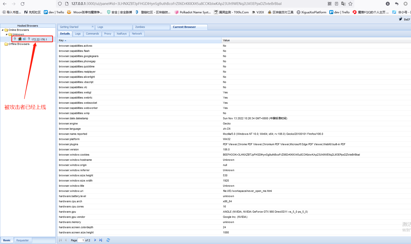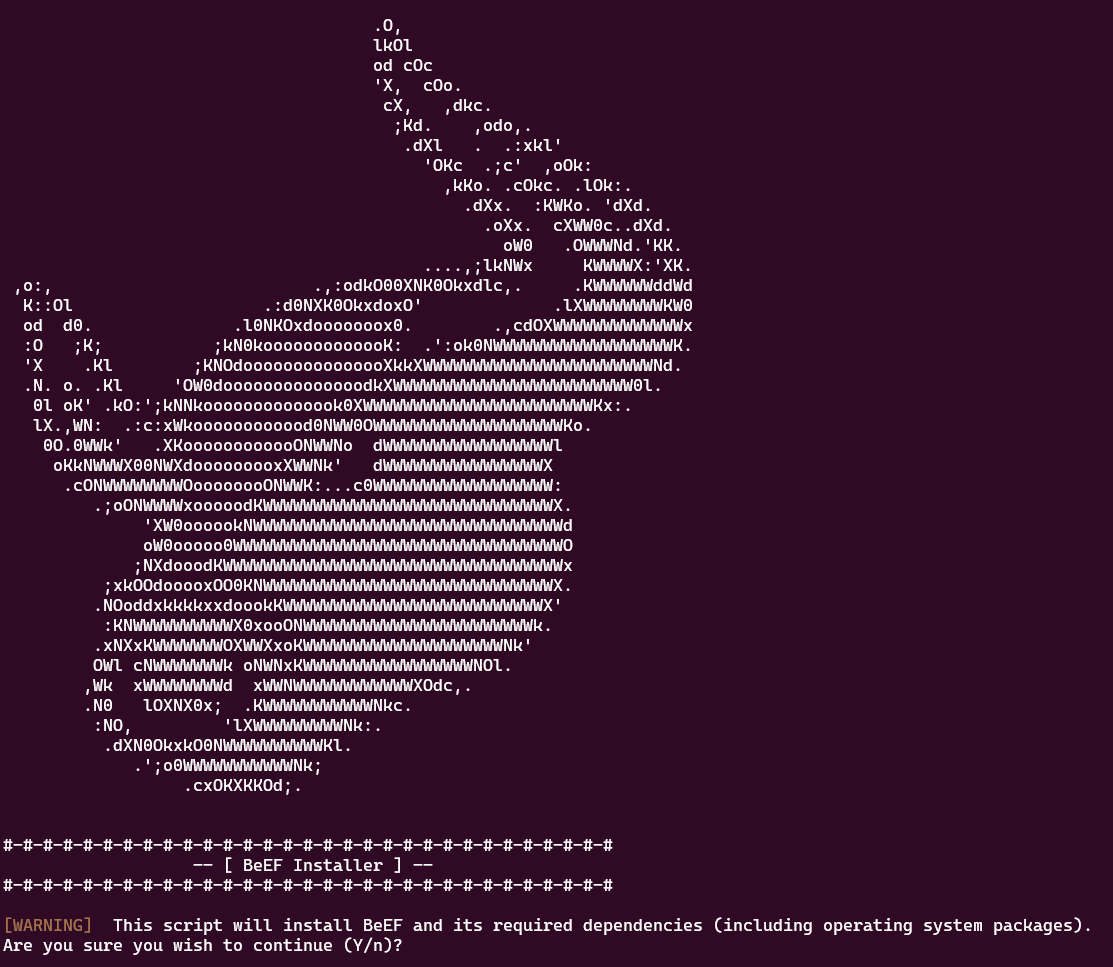 [10:13:44][*] Browser Exploitation Framework (BeEF) 0.5.4.0 [10:13:44] | Twit: @beefproject [10:13:44] | Site: https://beefproject.com [10:13:44] | Blog: http://blog.beefproject.com [10:13:44] |_ Wiki: https://github.com/beefproject/beef/wiki [10:13:44][*] Project Creator: Wade Alcorn (@WadeAlcorn) -- migration_context() -> 0.0207s == 1 CreateCommandModules: migrating ========================================== -- create_table(:command_modules) -> 0.0056s == 1 CreateCommandModules: migrated (0.0058s) ================================= ... == 25 CreateXssraysScan: migrating ============================================ -- create_table(:xssraysscans) -> 0.0070s == 25 CreateXssraysScan: migrated (0.0071s) =================================== [10:13:55][*] BeEF is loading. Wait a few seconds... [10:14:35][*] 8 extensions enabled: [10:14:35] | XSSRays [10:14:35] | Social Engineering [10:14:35] | Requester [10:14:35] | Proxy [10:14:35] | Network [10:14:35] | Events [10:14:35] | Demos [10:14:35] |_ Admin UI [10:14:35][*] 309 modules enabled. [10:14:35][*] 2 network interfaces were detected. [10:14:35][*] running on network interface: 127.0.0.1 [10:14:35] | Hook URL: http://127.0.0.1:3000/hook.js [10:14:35] |_ UI URL: http://127.0.0.1:3000/ui/panel [10:14:35][*] running on network interface: 172.22.187.159 [10:14:35] | Hook URL: http://172.22.187.159:3000/hook.js [10:14:35] |_ UI URL: http://172.22.187.159:3000/ui/panel [10:14:35][*] RESTful API key: ad8269157dd9dc78feb3339e376e5ef3684ffba1 [10:14:35][!] [GeoIP] Could not find MaxMind GeoIP database: '/usr/share/GeoIP/GeoLite2-City.mmdb' [10:14:35][*] HTTP Proxy: http://127.0.0.1:6789 [10:14:35][*] BeEF server started (press control+c to stop)