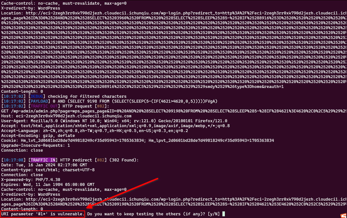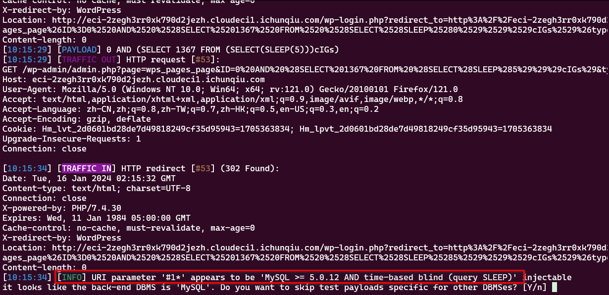 GET /wp-admin/admin.php?page=wps_pages_page&ID=0*&type=home HTTP/1.1 Host: eci-2zegh3rr0xk790d2jezh.cloudeci1.ichunqiu.com User-Agent: Mozilla/5.0 (Windows NT 10.0; Win64; x64; rv:121.0) Gecko/20100101 Firefox/121.0 Accept: text/html,application/xhtml+xml,application/xml;q=0.9,image/avif,image/webp,*/*;q=0.8 Accept-Language: zh-CN,zh;q=0.8,zh-TW;q=0.7,zh-HK;q=0.5,en-US;q=0.3,en;q=0.2 Accept-Encoding: gzip, deflate Connection: keep-alive Cookie: Hm_lvt_2d0601bd28de7d49818249cf35d95943=1705363834; Hm_lpvt_2d0601bd28de7d49818249cf35d95943=1705363834 Upgrade-Insecure-Requests: 1