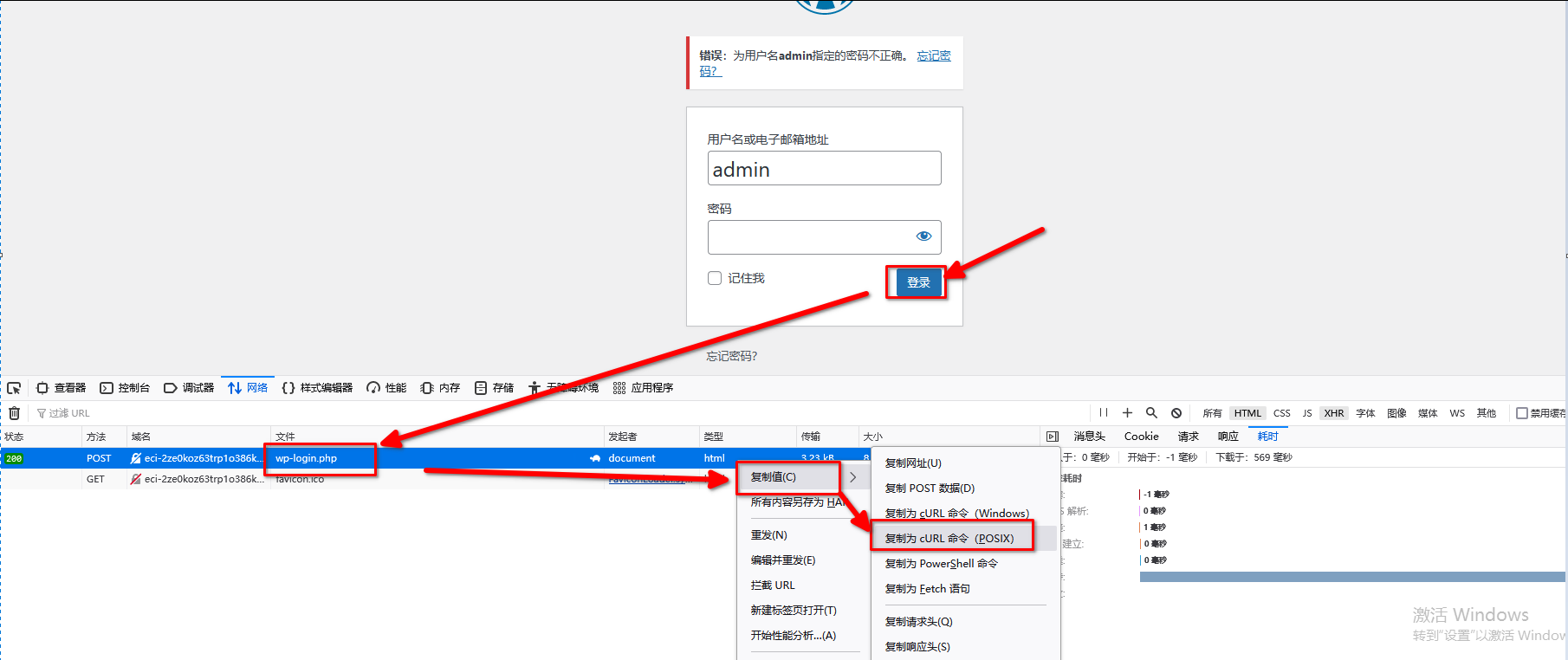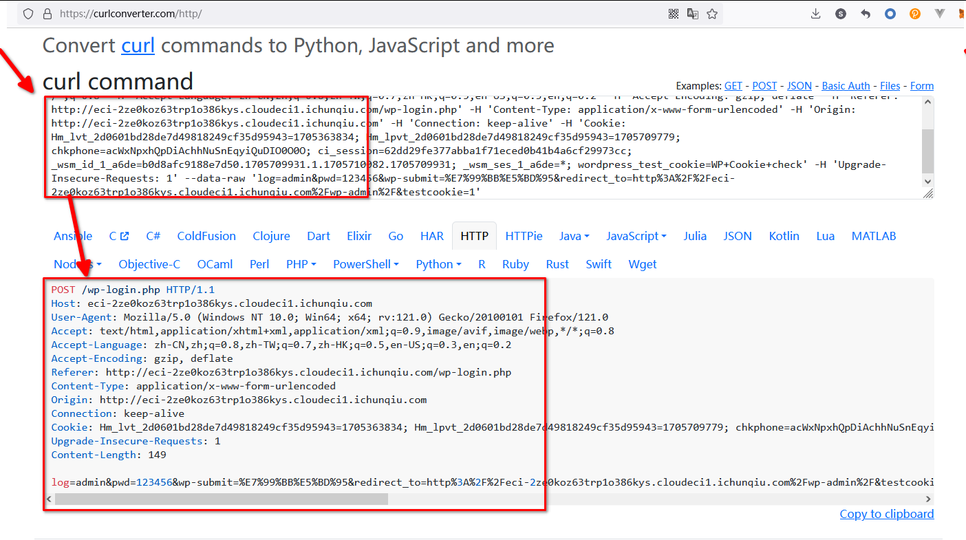 curl 'http://eci-2ze0koz63trp1o386kys.cloudeci1.ichunqiu.com/wp-login.php' --compressed -X POST -H 'User-Agent: Mozilla/5.0 (Windows NT 10.0; Win64; x64; rv:121.0) Gecko/20100101 Firefox/121.0' -H 'Accept: text/html,application/xhtml+xml,application/xml;q=0.9,image/avif,image/webp,*/*;q=0.8' -H 'Accept-Language: zh-CN,zh;q=0.8,zh-TW;q=0.7,zh-HK;q=0.5,en-US;q=0.3,en;q=0.2' -H 'Accept-Encoding: gzip, deflate' -H 'Referer: http://eci-2ze0koz63trp1o386kys.cloudeci1.ichunqiu.com/wp-login.php' -H 'Content-Type: application/x-www-form-urlencoded' -H 'Origin: http://eci-2ze0koz63trp1o386kys.cloudeci1.ichunqiu.com' -H 'Connection: keep-alive' -H 'Cookie: Hm_lvt_2d0601bd28de7d49818249cf35d95943=1705363834; Hm_lpvt_2d0601bd28de7d49818249cf35d95943=1705709779; chkphone=acWxNpxhQpDiAchhNuSnEqyiQuDIO0O0O; ci_session=62dd29fe377abba1f71eced0b41b4a6cf29973cc; _wsm_id_1_a6de=b0d8afc9188e7d50.1705709931.1.1705710082.1705709931; _wsm_ses_1_a6de=*; wordpress_test_cookie=WP+Cookie+check' -H 'Upgrade-Insecure-Requests: 1' --data-raw 'log=admin&pwd=123456&wp-submit=%E7%99%BB%E5%BD%95&redirect_to=http%3A%2F%2Feci-2ze0koz63trp1o386kys.cloudeci1.ichunqiu.com%2Fwp-admin%2F&testcookie=1'
