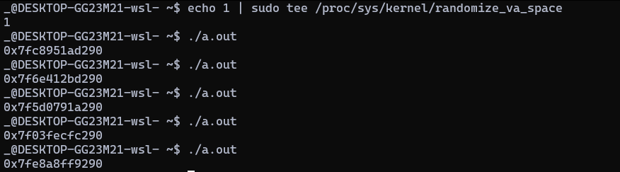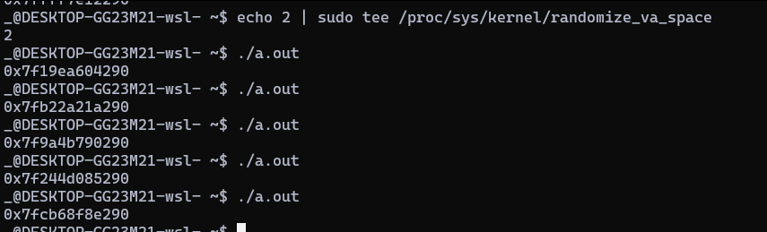 echo 2 | sudo tee /proc/sys/kernel/randomize_va_space
