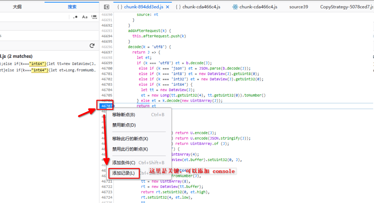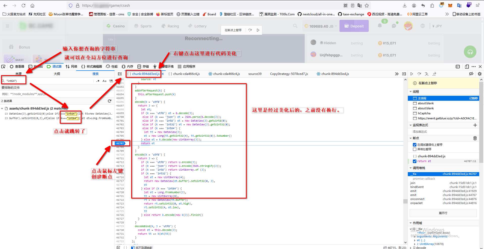 点击“调试器”tab, 就可以进行: 全局查询关键词,代码美化,打断点
