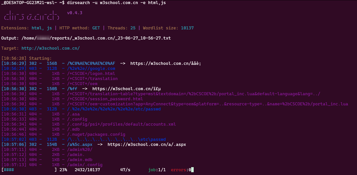 dirsearch -u w3school.com.cn -e html,js